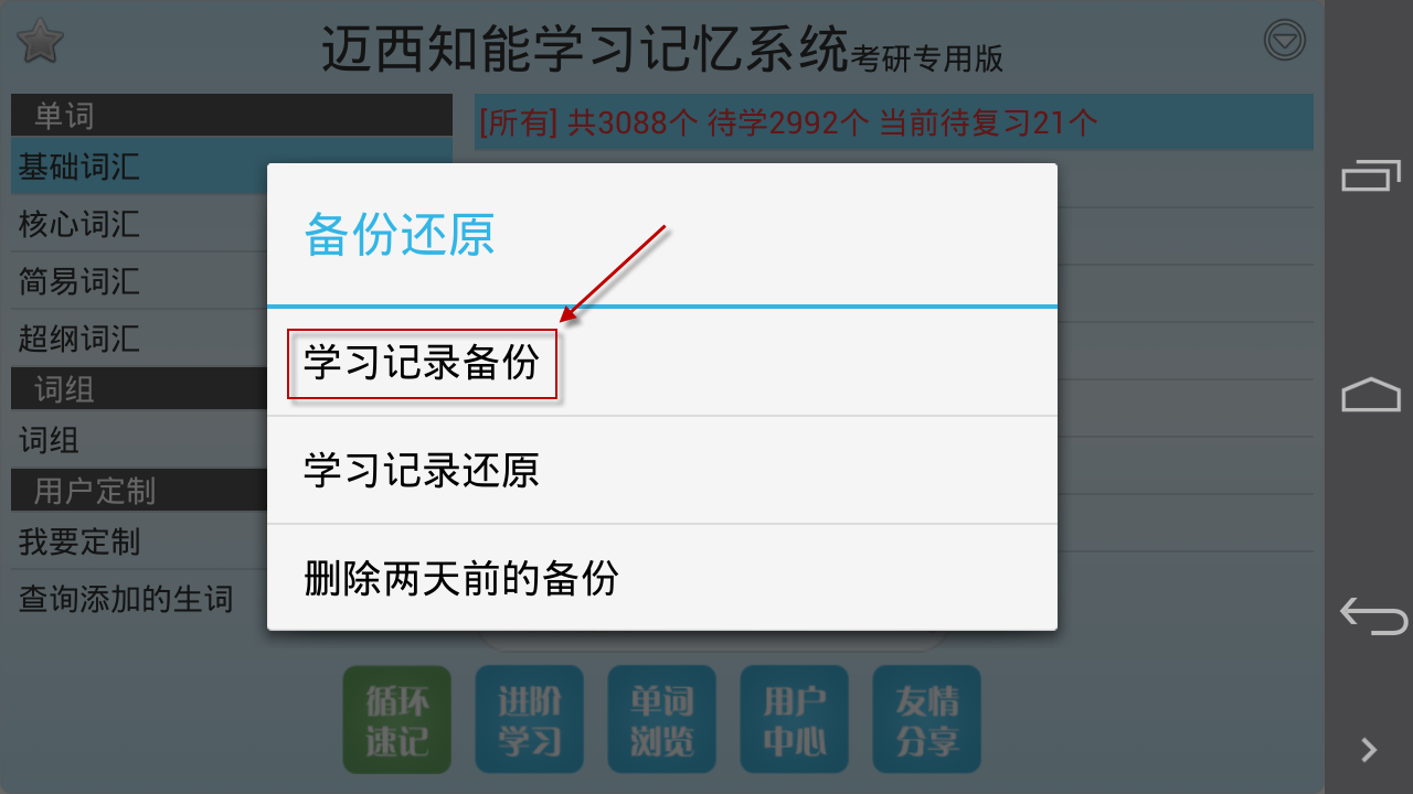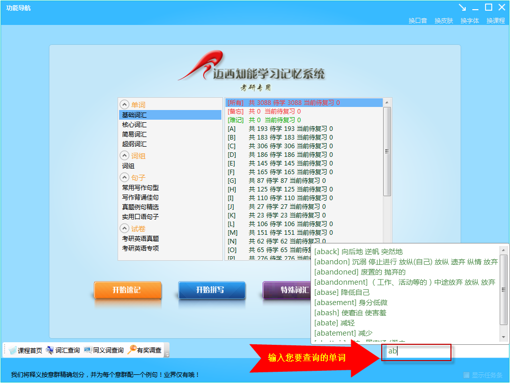 2、特殊词汇:将“熟记词汇”、“难记词汇”、“备忘词汇”、“每日记忆”等统称为特殊词汇。